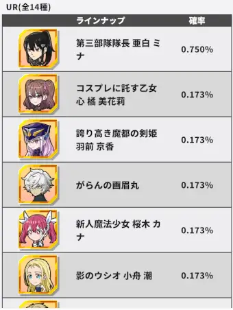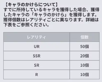URが一度でも同じのがでると、URのかけらが50個もらえるので、実質重ねると同じ効果となります。